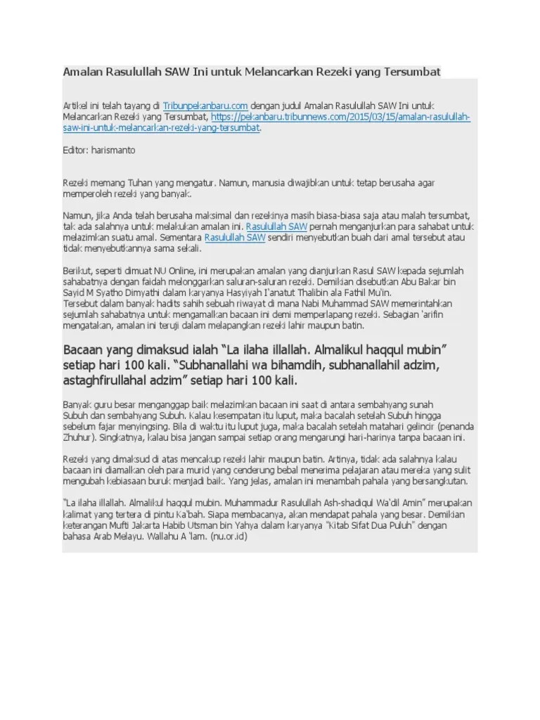 "tersebut dalam banyak hadits sahih sebuah riwayat di mana nabi muhammad saw memerintahkan sejumlah sahabatnya untuk mengamalkan bacaan . Tidak ada yang yang sesungguhnya disembah tetapi engkau, ya allah. Video ini adalah tentang dzikir magnet rezeki * lailahaillallah al malikul haqqul mubin muhammadurrosulullah shodiqul wa'dil amin . Tulisan suci engkau, sesungguhnya saya yakni dari orang yang membuat zalim. . "barangsiapa membaca 'laa ilaaha illallah al malikul haqqul mubin' seratus kali dalam sehari, maka memperoleh jaminan aman dari . Almalikul haqqul mubin" setiap hari 100 kali.